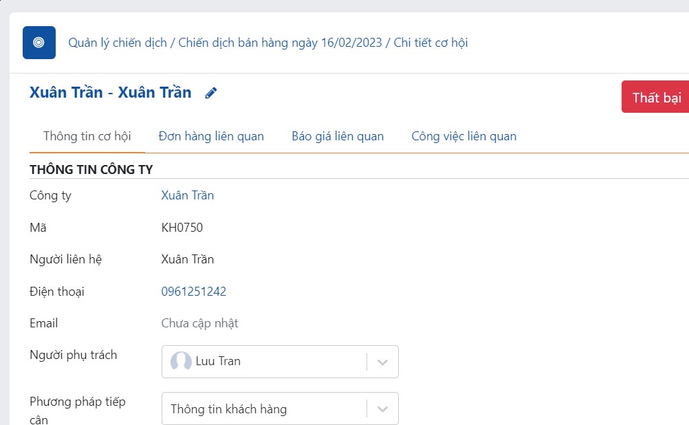 Trong cơ hội chiến dịch thì Tên khách hàng ghi thành Tên công ty là không chính xác